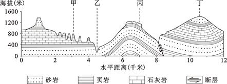 小题3:图中①处岩石类型最有可能为?。若C处岩石中含有三叶虫化石,则可判断其形成时的地质年代为____?。