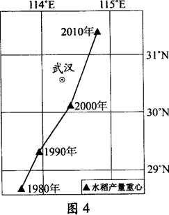 2、单选题 图4为根据统计资料计算出的我国1980-2010年水稻产量重心移动方向图。若下列地区的水稻产量均有增加,则对图示水稻产量重心移动趋势贡献最大的地区是
