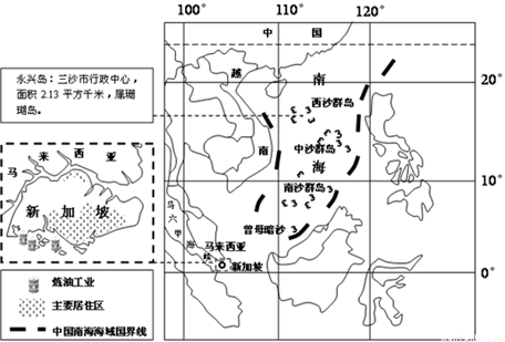 材料二:2012年7月24日,海南省在西沙群岛成立三沙市,下辖西沙、中沙和南沙群岛的岛礁及其海域。 (1)永兴岛的气候类型是 ;永兴岛淡水资源缺乏的原因是 。(3分) (2)列出该岛获取淡水资源二种可能方式 、 。(2分) (3)新加坡炼油工业分布在南部岛屿,与主要居住区分离。分析新加坡发展炼油工业的优势条件。(8分)