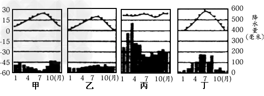 3、单选题 读甲、乙、丙、丁四地气候类型的气温与降水月份分配图,因气压带、风带的交替控制而形成的是气候类型是