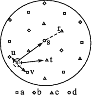 小题3:甲区域的居民可以沿图示箭头到达附近城市寻求服务总是采用就近原则,甲区域的居民同等线最近的是u,t与同等级城市相比离甲较远,一般不会到达,B对。