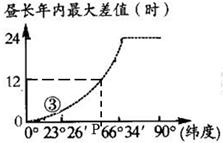 小题1:可通过简单计算验证即可。各地昼长年内的变化特征,赤道(0°)上全年昼夜等长,昼长年内变化为0时;66°34′-90°纬度范围内会出现极昼极夜现象,昼长年内变化都为24小时,所以各地昼长年内最大差值随纬度变化的曲线是③曲线。各地正午太阳高度年内最大差值变化特征,赤道上二分日正午太阳高度最大,为90°,二至日最小,为66°34′,最大差值为23°26′;北回归线(23°26′N)上,夏至日正午太阳高度最大,为90°,冬至日正午太阳高度为最小,为43°08′,最大差值为46°52′;同理,可以计算验证66°34′和90°纬度正午太阳高度年内最大差值,⑦线最符合此规律。