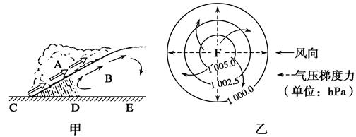 本题解析: 小题1:图示C、D、E位于锋面图示中,由于锋面附近,暖气团上升而在锋面附近D处形成降雨,而乙图中,水平气流呈辐散,故判断F为高压中心,盛行下沉气流,则天气晴朗。 小题2:甲图中锋面下的冷气团后退,故判断甲为暖锋;而乙图水平气流呈辐散,故判断乙图为高压,反气旋。 点评:本题难度一般,学生只要根据气团的分布和运动判断锋面性质;根据水平气流运动判断气压分布,并结合锋面的天气特征和低压、高压系统的天气特征分析,对于此类试题,准确的读图是解题的关键。