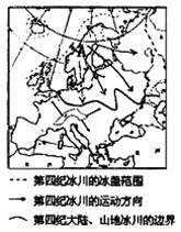 【小题1】由图中看到,欧洲第四纪大陆冰川边界在南侧的走向是东西走向(与纬线平行),是由于纬度不同获得太阳辐射的热量不同的原因。所以A对,东西走向并不是海陆位置不同(水分原因),洋流只能影响沿海地区,还是西欧的地形是平原,东西相差不大,故B、C、D错误。正确答案是A。
