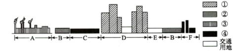 (1)从图中可以看出D区建筑物高大密集,而且位于市中心,所以D代表中心商务区的,A区位于城市外围,距离市中心较远,而且占地面较大,所以代表工业区的是A,低级住宅区往往与工业区相联系,离工业区较近,有利于工人上下班,节省交通费用,所以C代表低级住宅区,高级住宅区往往与工业区、低级住宅区背向发展,,位于城市外围环境较好的地区,所以F代表高级住宅区。