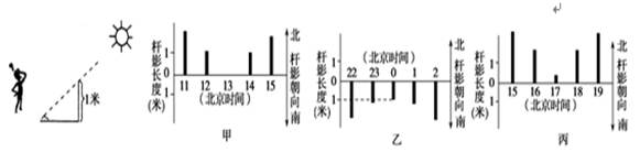 1.甲、乙、丙三地该日昼长,由长到短的顺序是2.当乙地测得该日杆影长最短时,丙地所在时区的区时是3.甲图所示地,位于我国某省(区),下列对联或诗句中可反映该省(区)地理特征的是