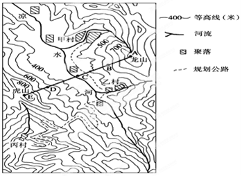 (3)图中虚线是规划在几个村庄之间修建的公路。乙村到甲村的线路比较平直,乙村到丙村的线路比较弯曲,呈“之”字型。分别说明这样修建的原因。(4分)
