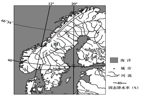 (1)图示甲半岛是北欧的斯堪的那维亚半岛;固态降水主要是降雪;纬度高气温低,降雪多,北部高于南部;中部山地海拔高,气温低,降雪量大于东西两侧的低地;西北部沿海地形起伏大,降雪的空间变化较大,东南部沿海地形起伏小,降雪的空间变化较小。
