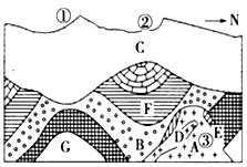4、单选题 下图为某地区地质剖面图,其中C为沉积物,B、F、G为沉积岩,A、D为不同时期的岩浆岩,E为变质岩。读图完成下列各题。