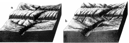 小题2:根据图示的断层逐渐张裂,及裂谷带河流从无到有的发育过程判断顺序。