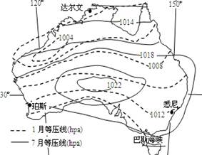 【小题1】澳大利亚大陆7月最高气压与1月最低气压的差值最大接近( )hpa。 A.18 B.20 C.22 D.24