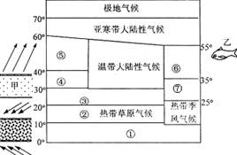 (1)图中甲气压带________;该图所示是北半球的________(季节),判断理由是________。 (2)据图分析,气候类型⑤分布的一般规律是________(要说明纬度位置和海陆位置);气候类型③的成因是________。 (3)气候类型④所示地区植被类型________,该地区主要的水果如________。 (4)由气候①→②→③→④→⑤变化所产生的自然带变化反映了________的地域分异规律。 (5)气候⑦在北美洲不如亚洲典型的原因是________。 (6)若本图表示亚欧大陆,乙附近是________、________(洋流),交汇形成的________渔场。