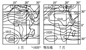 本题解析:从气温一降水图中可看出,甲地气温各月都很高,降水总量大且集中于夏季,冬季相对较少。全年高温与该地所处的低纬度位置有关;从气压带图中可看出,夏季该地受西南风影响,来自西南海洋的暖湿气流使其降水量大增.而冬半年,盛行东北风.多干燥少雨天气。乙地为沙漠,因沙尘天气而能见度低;丙地沿海受寒流影响,降温使大气水汽凝结而多雾,导致大气能见度低。