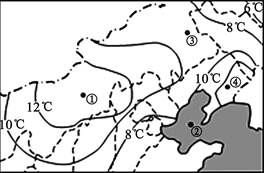 小题2:从图中等值线稀疏程度不同可看出,③地等值线较为稀疏,说明其降温辐度小,而④地等值线较为稠密,说明其降温辐度大。原因是③地位于大兴安岭东侧,处于西北风的背风坡,降温辐度小。正确答案是B。