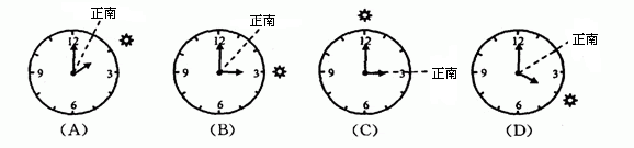 4、单选题 某学校(105°E,东七区)的同学在北京时间15时开展研究性学习活动,他们根据太阳方位和手表来确定方向,使用的方法与步骤如下:①将手表时间转换为当地地方时;②将手表平放, 时针对准太阳;③手表12时刻度线与时针之间夹角(<180)的角平分线大致为正南方。下图中能够大致反映此时正南方位的是