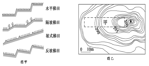 【小题1】根据图甲可知,坡式梯田出现在整体坡度较均匀且坡度较缓的地区,水平梯田和隔坡梯田的区别在于水平梯田分布在坡度较陡的地区;反坡梯田出现在坡度较陡,并且相邻坡向不同的地区。图中甲处,在10m长度内,陡坡落差5米,坡度较小,且有明显的陡缓之分,故选择C选项