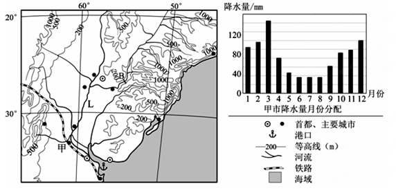 A.甲处能欣赏到瀑布景观 B.图中最高处海拔为550~600米 C.受副高影响,7月河流流量全年最小 D.乙处位于山脊(分水岭) |