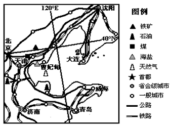 3、综合题 ? 环渤海经济圈狭义上指中国辽东半岛、山东半岛、京津冀为主的环渤海滨海经济带,广义上延伸可辐射到山西、辽宁、山东及内蒙古的部分地区。环渤海地区是我国经济发展较快的地区之一。读图,回答下列问题。