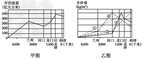 4、单选题 甲图和乙图分别是黄河干流年径流量和含沙量的变化图。读图,回答1~2题。