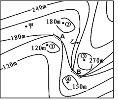 B处地形是 (山脊、山谷),若图中有一条河流,则该河流应在 处附近,流向 。(6分)