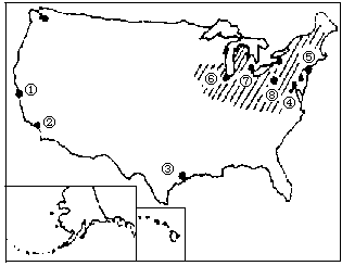 图5-38 (1)写出图中数码代表的美国著名城市名称: ①?②?③?④?⑤? ⑥?⑦?⑧? (2)美国东北部工业区形成和发展的有利条件是: ①?;②?;③?;④?;⑤?。
