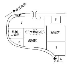 参考答案:钢铁工业——D?高科技工业——B?水厂——A?污水处理厂——F?纺织工业——C?货运码头——E