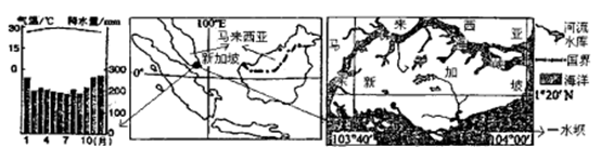(1)读新加坡气候资料图可知,新加坡各月平均气温约30度,降水量大,年降水量超过2000mm,属于终年高温多雨的热带雨林气候。气候成因是位于热带,终年受赤道低气压控制,盛行上升气流,多对流雨,形成了终年高温多雨的热带雨林气候。