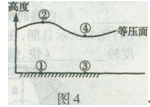 本题考查等压面的知识。同一等压面气压值相等,所以②处气压等于④处。近地面气压高于高空气压,高空气压状况和近地面气压状况相反,则③处气压最高,近地面气流从③流向①。所以本题选择D选项。