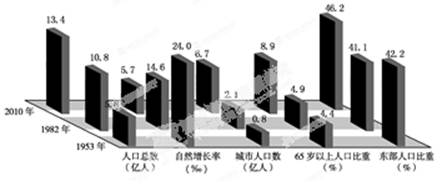 小题3:根据材料二中1950-2050年中国14岁以下与65岁以上人口百分比统计折线图可以看出,我国65岁以上人口数量首次超过14岁以下人口数量的时间大约在_______年,试说明造成中国人口老龄化加速的原因以及对我国经济的发展将带来的负面影响。 3、单选题 新中国成立后人口增长模式的特征是 4、单选题 下图为中国人口普查数据统计图。读图,回答下列各题。 |