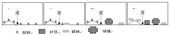 1、单选题 下图为一组剖面示意图。反应了我国华北某地区土地利用状况由t1时期→t4时期的历史变化过程(t1时期→t4时期气候变化甚微,可忽略不计;图中河流断面位于中游处)。据此完成下列各题。
