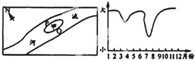 5、单选题 下组图中,左图为我国某河流河道示意图,甲为一河心沙洲,右图为该洲一年内面积变化统计图,读图完成下列各题。