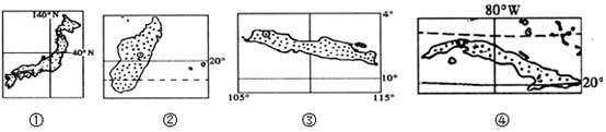 2、单选题 当北京地区座北朝南的房屋内,正午阳光照射面积最大时,下图中各岛正午太阳高度由大到小排列正确的是(?)