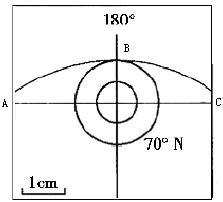 本题解析:1.图中从极点到纬度70度,经线间隔为20度,经线段长度为111千米乘以20,折合成厘米为222 000 000厘米,从极点到纬度70度的图上距离为1厘米,故比例尺为1:222 000 000。