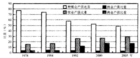 5、单选题 下图是我国1978年~2005年东部沿海地区农业产值结构变化统计图,完成1—2题。