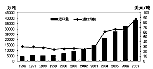 材料二:1996—2007年中国铁矿石进口量及均价