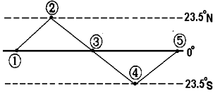 5、单选题 2007年10月24日18:05(北京时间),中国自己设计的“嫦娥一号”月球探测卫星发射升空,开始了太空旅行。阅读该图:太阳直射点周年变化示意图,回答问题。