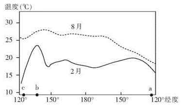 2、单选题 读太平洋沿某一纬线表层水温变化简图,回答下列问题。