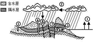 ⑴ 图中水循环的主要环节名称是: ①?? ②_____________ ③ ? ④_____________ ⑵根据地质构造,图中⑦处属于__________构造。下列地区成因与其相同的是________。 A.华北平原 B.黄土高原 C.渭河平原 D.东北平原