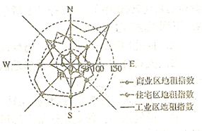3、单选题 城市地域功能区地租指数是指城市某功能区单位面积土地租金与该区人口日流通量的比值。图为世界某城市地域功能区地租指数与布局方位雷达图。读图回答问题。