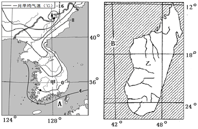 小题1:据图分析,m处温度为-20℃,n处温度为0℃,所以一月甲国所在半岛北部m山地和南部n地的温差20℃。