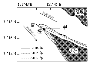 5、单选题 下图为“长江口分流沙洲洲头年平均5m等深线变化图”,下列有关2004~2007年等深线位置变化原因叙述可能性最小的是: