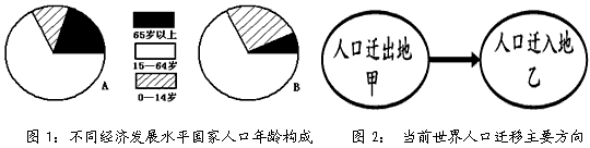 (4)若图2表示A、B两类国家之间的人口迁移,则与甲对应的是_________(填A或B)类国家,这种变