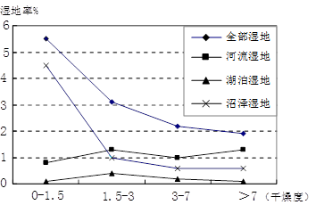 本题解析: 小题1:从图中看湖泊湿地与河流湿地与干燥度并不呈正相关关系,全部湿地和沼泽湿地与干燥度呈正相关关系,导致总湿地与干燥度呈负相关关系的最主要因素是沼泽湿地,沼泽湿地随干燥度的变化最明显。 小题2: 黄河下游湿地主要是河流入海口的沼泽湿地,上游来水量大,河口的沼泽湿地面积就大;南水北调东线工程建设需要加强蓄水工程建设,以满足提水的需要,增加的主要是湖泊湿地;黄河下游地区水资源紧张,不宜发展水稻生产,因此扩大水稻种植面积并不是提高湿地率的有效措施。