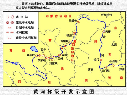 兰州至包头河段降水少,黄河水量大量减少,故而比包头流量大。包头河段地形平坦,流速小。兰州河段夏秋多暴雨,水土流失严重,河流含沙量大。而兰州至包头河段,地形平坦,流速减缓,泥沙大量沉积。故而包头河段含沙量较小。兰州河段落差大,流速快,水能丰富(下图)。