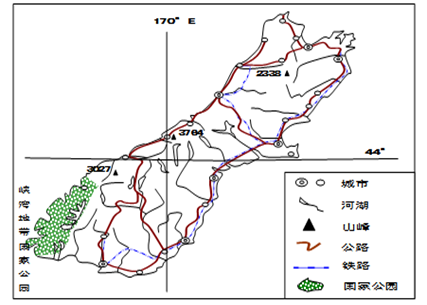 4、单选题 下图所示为新西兰南岛,面积约为15万平方千米。读图,回答下列小题。