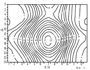 【小题1】根据等值线数值变化规律,一天中最低气温出现在日出前,6时左右,A错。一天中最高气温出现在午后,14时左右,B对。月均温最高值出现在7月份,C错。1月份月均温最低,D错。