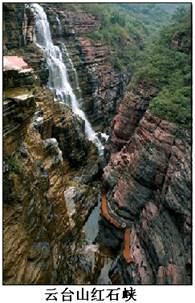 4、单选题 河南云台山红石峡(见下图)是我国北方地区少有的丹霞地貌峡谷景观,构成石峡的红色岩石是在距今12亿年前后的海滨沙滩环境下形成的。下列对该景观形成的地质作用过程的描述正确的是