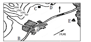 1、综合题 读“某城镇现状图”,拟在A、B、C、D、E五地建立火电站、钢铁厂、化工厂、服装厂和自来水厂5个工厂,选择正确的厂址并说明理由。(10分)