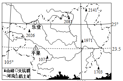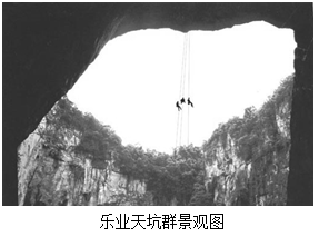 材料三:“天坑”是四周皆被刀削似的悬崖绝壁所围,形成一个巨大的竖井,底部有地下河相通。乐业天坑群位于中国广西乐业县,占地约20平方千米。地质调查发现,乐业天坑群所在地区石灰岩分布区。