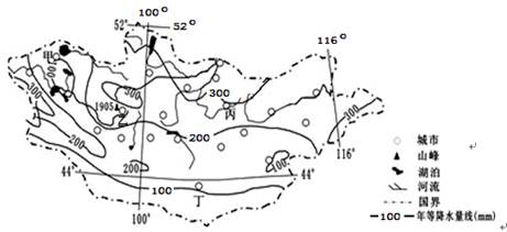 小题1:读图,根据降水量分析,甲、丁两地的降水少,是干旱区,不适宜人口居住,A、D错。乙地位于山区,地形条件差,不适宜居住,B错。丙地降水较多,是半干旱区,地形平坦,临河,取水方便,适宜城市的形成发展,所以人口最多的应该是丙城市,C对。